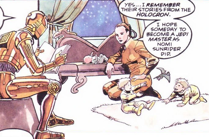 A la edad de tres años, los gemelos se embarcaron en una aventura infantil. Logrando escurrirse de C-3PO, los dos tomaron un turbo ascensor decomisado en las tenebrosas profundidades de Coruscant. Felizmente fueron rescatados antes de que se hicieran daño.
